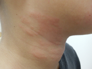 じんましんは、皮膚に突然あらわれる赤く盛り上がった発疹で、強いかゆみを伴います。数時間で消えるのが特徴です。じんましんは、原因がはっきりしないことも多いです。