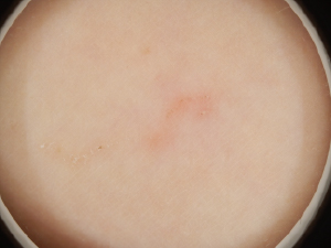 専用のデルモスコープで写真を撮影すると、ダニの皮膚トンネルが確認できます。