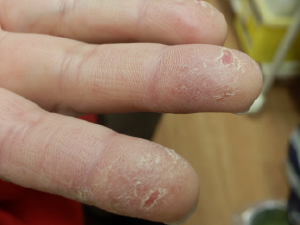 植物、金属、化粧品ゴム製品医薬品などによるアレルギー反応もしくは、洗剤や衣服のこすれなどの物理的刺激、極端な温度(熱湯・冷却剤の接触)で発症します。