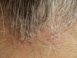 皮膚が赤く盛り上がり、銀白色のフケのようなかさぶたが出現。