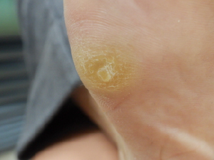 足裏などの圧迫部位にできる硬い角質。歩くと痛みがあります。当院で治療可能です。