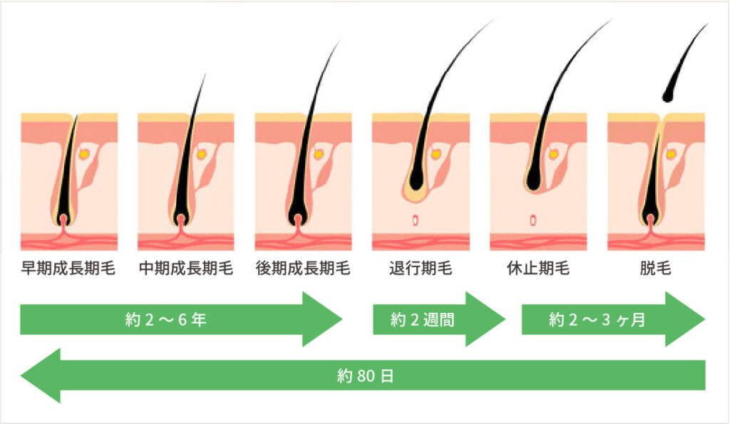 休止期ではレーザーに反応しないため、6-8週ごとに繰り返し脱毛をする必要があります。